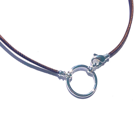 A LA LOOP necklace lives within a unique category of accessory that merges the elegant clean lines of a necklace with a simple silver circle crafted to hold glasses. This piece is hand made from soft and supple Italian lambskin leather in a festive bronze, which comes from a mill outside of Venice who’s been producing fine leather accessories since the 1960s.
