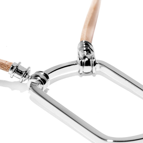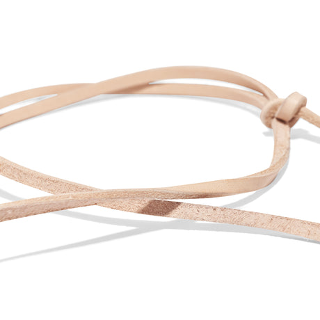 A LA LOOP necklace lives within a unique category of accessory that merges the elegant clean lines of a necklace with a simple silver circle crafted to hold glasses. This piece is hand made from a raw edge Italian leather in a fresh spring neutral, with a versatile, unisex military-inspired dog tag.