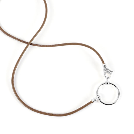 A LA LOOP necklace lives within a unique category of accessory that merges the elegant clean lines of a necklace with a simple metal circle crafted to hold glasses. This classic leather LA LOOP is re-imaged in a soft spring earth tone that is sure to become part of your everyday jewelry. This piece is hand made from soft and supple Italian lambskin leather, which comes from a mill outside of Venice who’s been producing fine leather accessories since the 1960s.