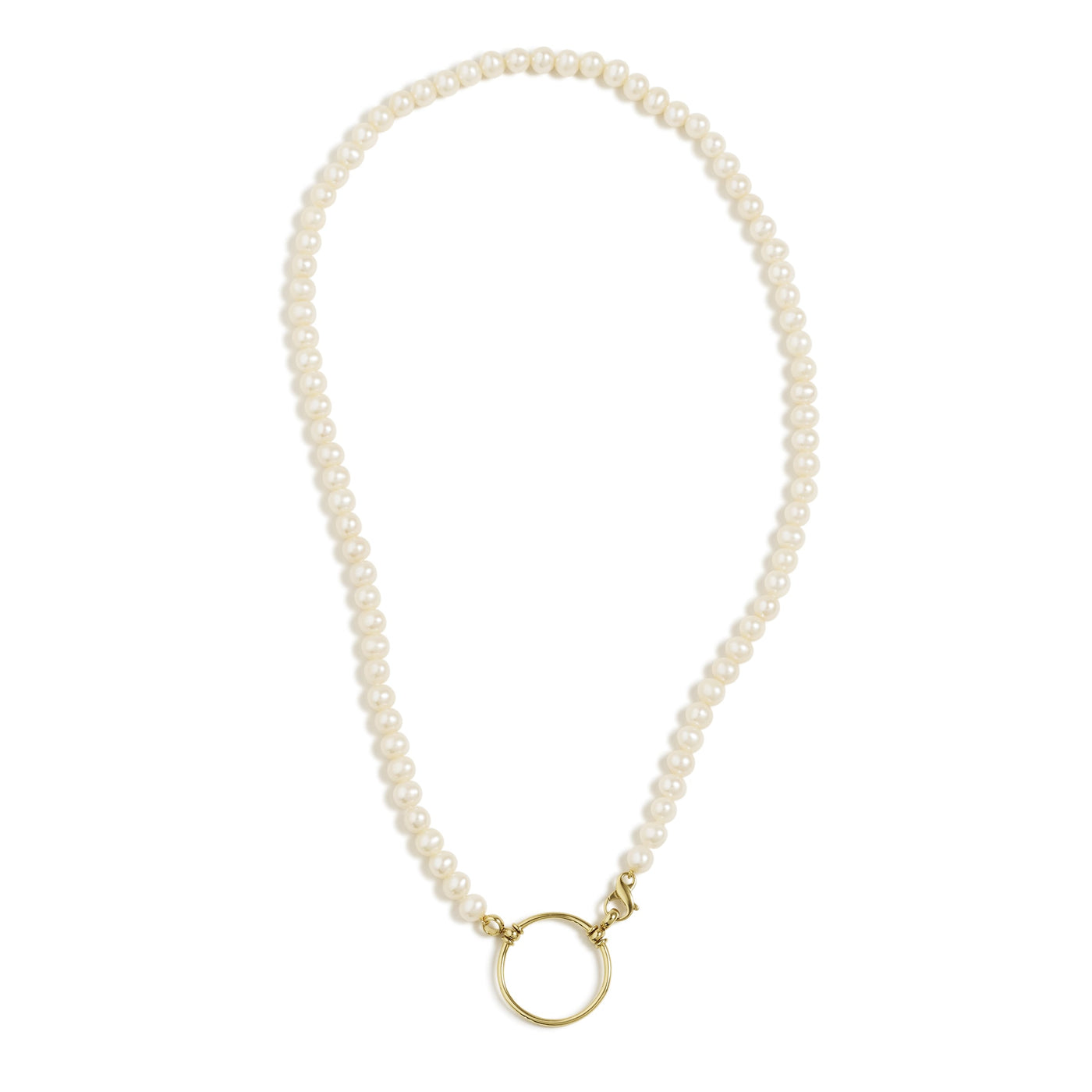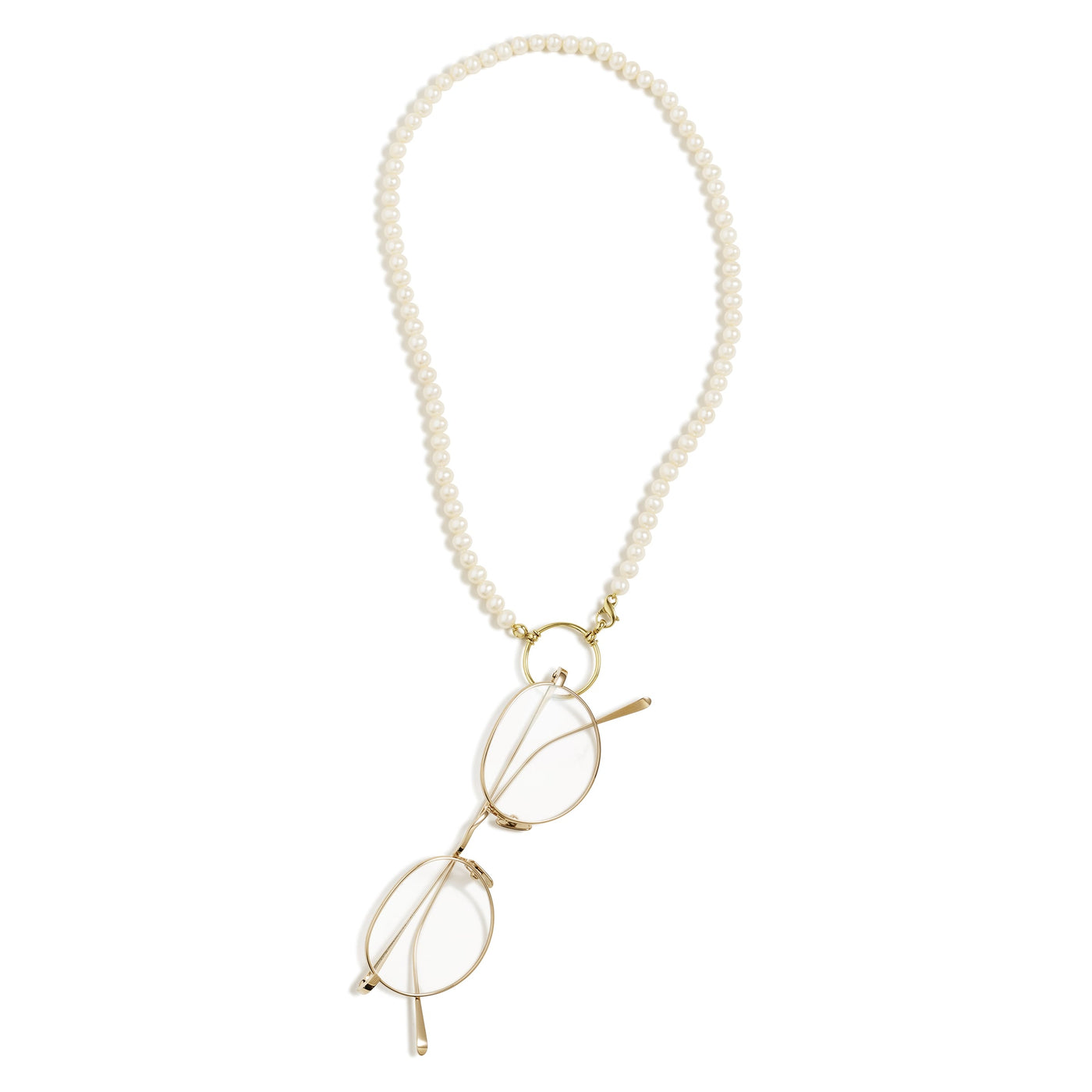 A LA LOOP necklace lives within a unique category of accessory that merges the elegant clean lines of a necklace with a simple metal circle crafted to hold glasses. This necklace takes our classic pearl and gives it a fresh update with 24k gold plated hardware.
