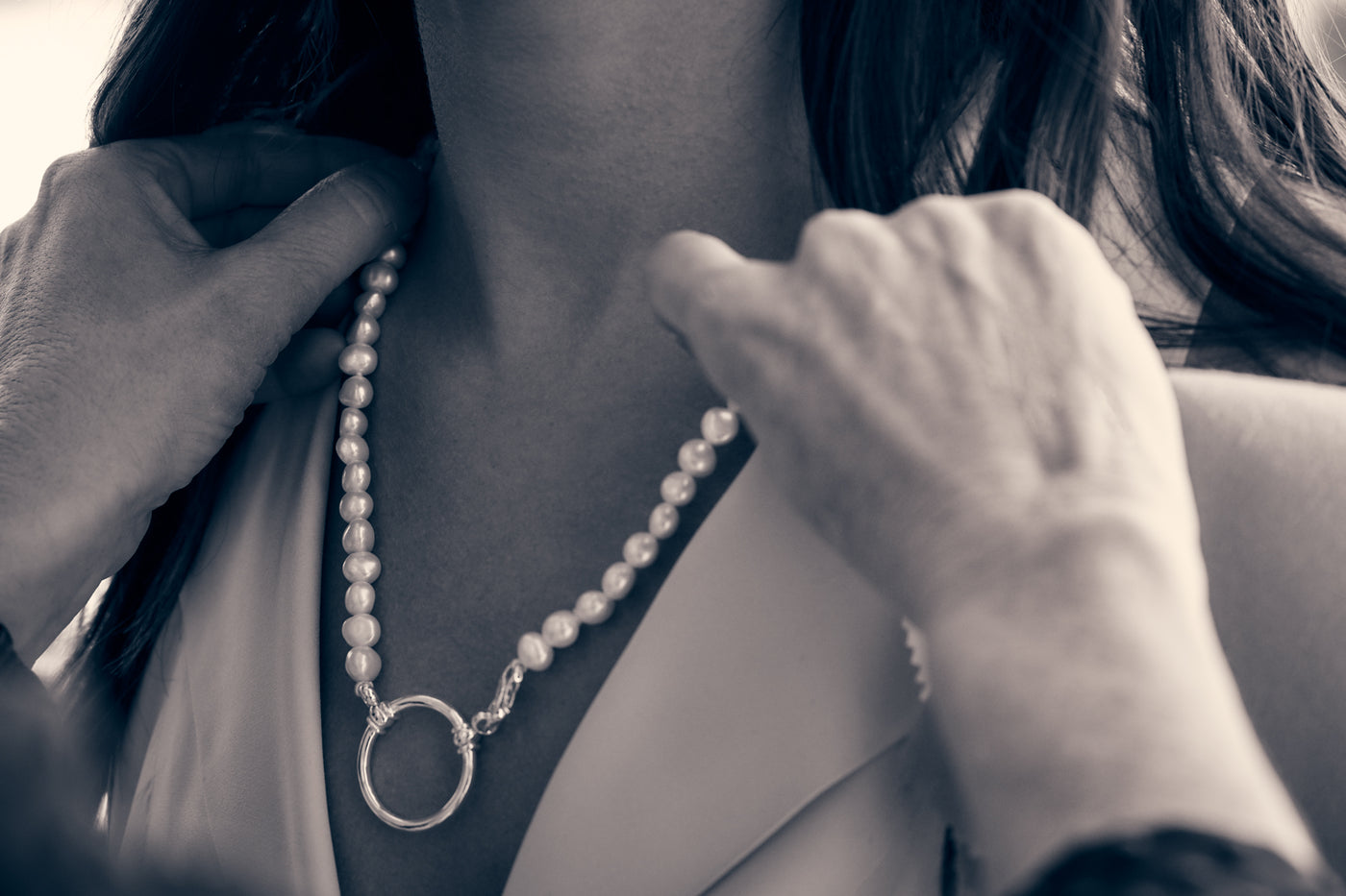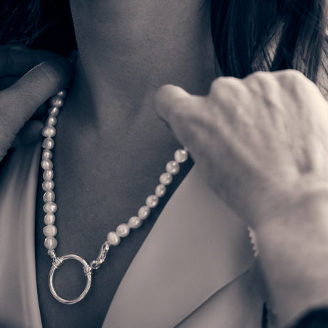 A LA LOOP necklace lives within a unique category of accessory that merges the elegant clean lines of a necklace with a simple silver circle crafted to hold glasses. This pearl necklace is one of our classic Jewelry pieces with a refreshing organic twist in its irregular shaped pearl nuggets—a necklace designed for simple everyday elegance.