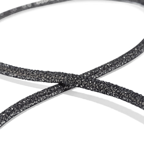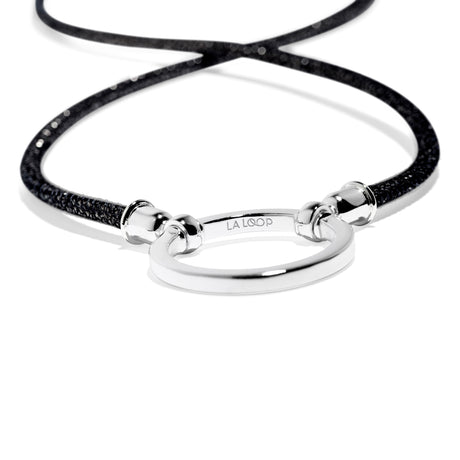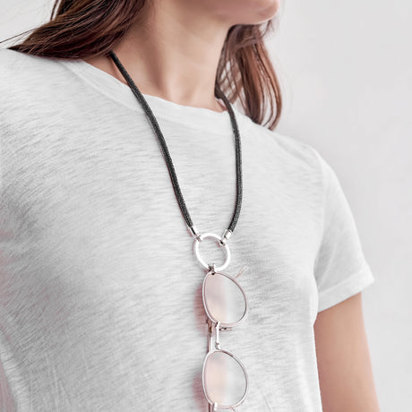 A LA LOOP necklace lives within a unique category of accessory that merges the elegant clean lines of a necklace with a simple silver circle crafted to hold glasses. This piece is hand made from braided Italian calf skin leather, which comes from a mill outside of Venice who’s been producing fine leather accessories since the 1960s. Named after the lead character Katharine Clifton in the film, The English Patient, The Clifton is a classic, and this metallic, crackly “Galaxy” finish takes it out of this world!