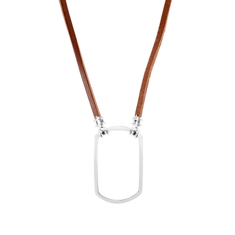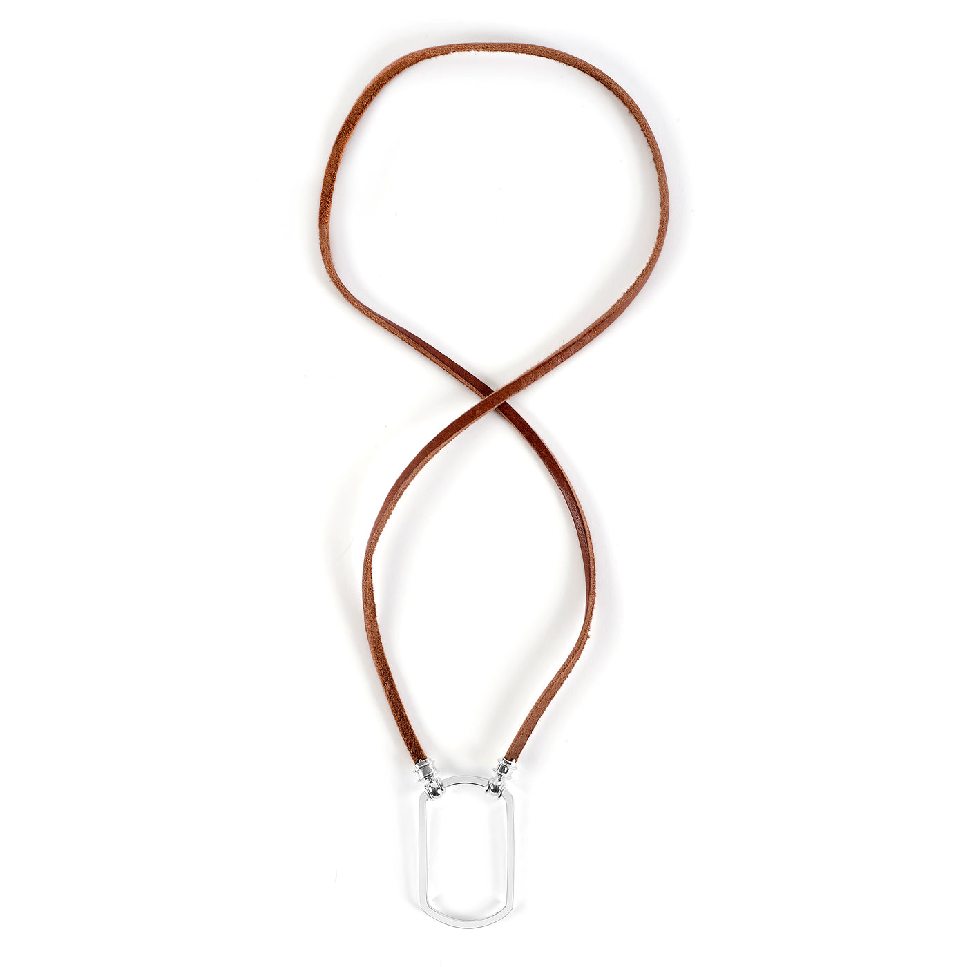 A LA LOOP necklace lives within a unique category of accessory that merges the elegant clean lines of a necklace with a simple metal circle crafted to hold glasses. This piece is hand made from a raw edge Italian leather, with a versatile, unisex military-inspired dog tag.