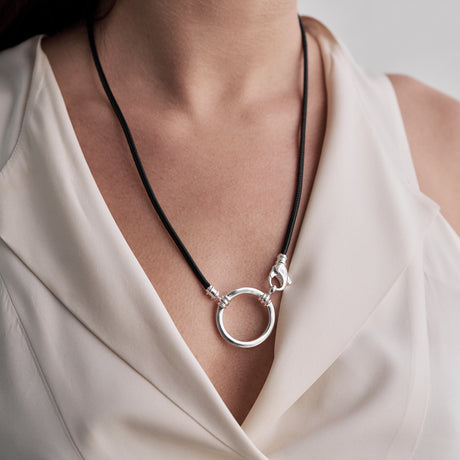 A LA LOOP necklace lives within a unique category of accessory that merges the elegant clean lines of a necklace with a simple silver circle crafted to hold glasses. This piece is hand made from solid sterling hardware and supple Italian lambskin leather, which comes from a mill outside of Venice who’s been producing fine leather accessories since the 1960s.