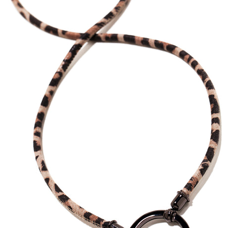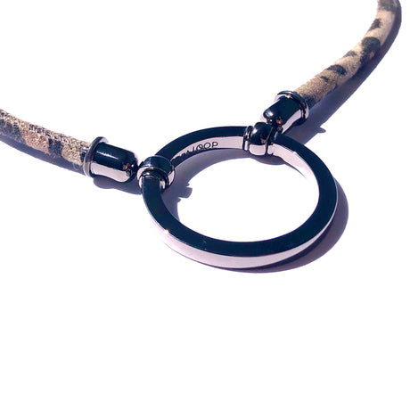 A LA LOOP necklace lives within a unique category of accessory that merges the elegant clean lines of a necklace with a simple silver circle crafted to hold glasses. This piece is hand made from soft stitched Italian calf skin leather, which comes from a mill outside of Venice who’s been producing fine leather accessories since the 1960s. Named after the lead character Katharine Clifton in the film, The English Patient, The Clifton is a classic. The Leopard Print pairs boldly with the shiny gunmetal loop, creating this unforgettable, unique take on a LA LOOP original, an easy way to add a touch of glam to any outfit.