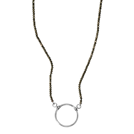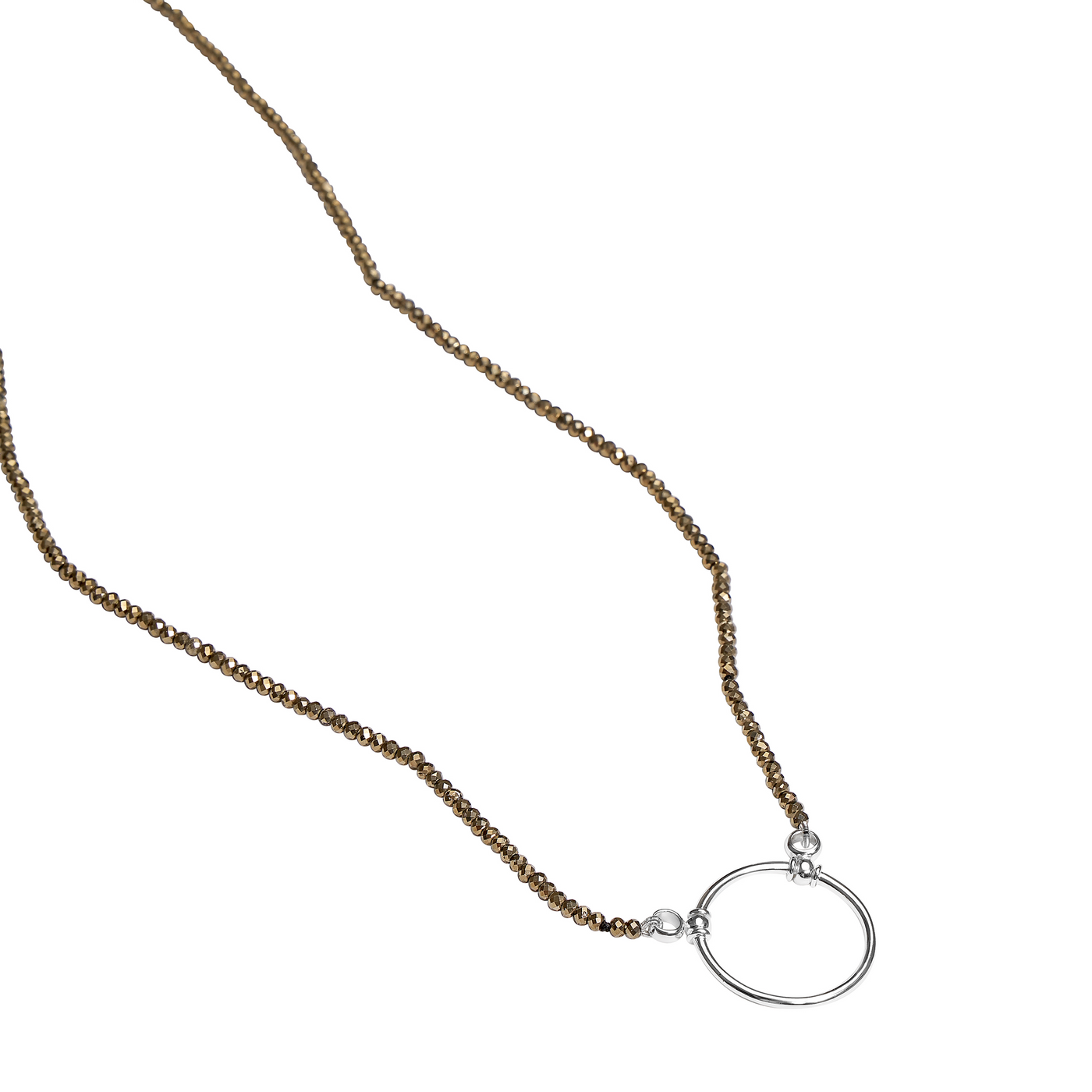 A LA LOOP necklace lives within a unique category of accessory that merges the elegant clean lines of a necklace with a simple silver circle crafted to hold glasses. Pyrite is a symbol of wealth and good luck, not to mention it has beautifully lustrous and rich neutral coloration that is perfect for everyday wear and layering with other silver and beaded necklaces.