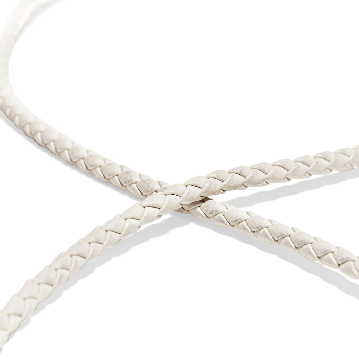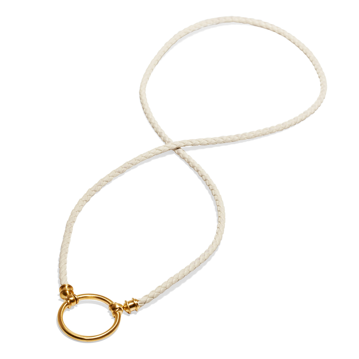 A LA LOOP necklace lives within a unique category of accessory that merges the elegant clean lines of a necklace with a simple silver circle crafted to hold glasses. This piece is hand made from braided Italian calf skin leather, which comes from a mill outside of Venice who’s been producing fine leather accessories since the 1960s.