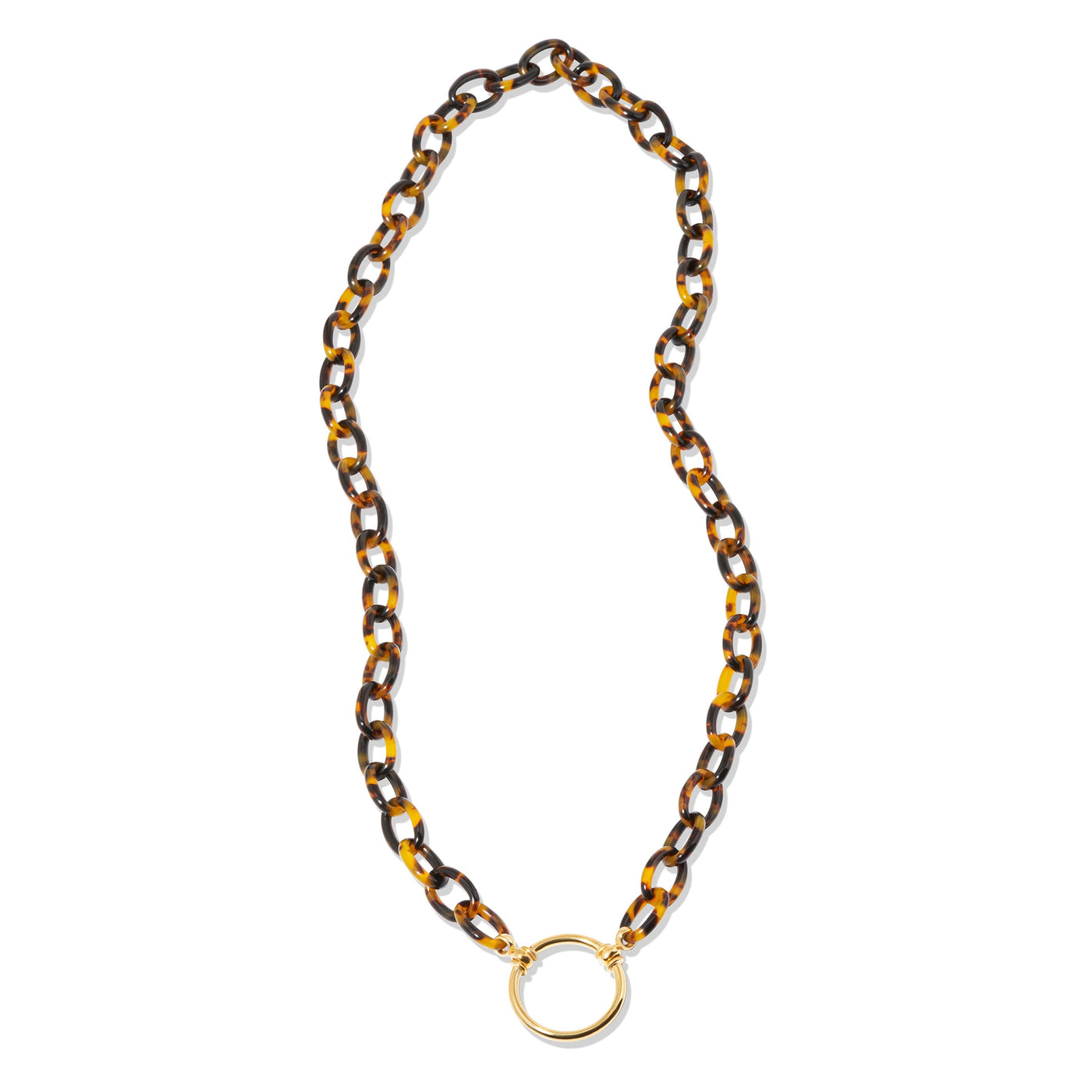 A LA LOOP necklace lives within a unique category of accessory that merges the elegant clean lines of a necklace with a simple metal circle crafted to hold glasses. The Small Tortoise Link was the very first LA LOOP necklace, and you could say it started a movement. Acetate is a plant-based composition that’s lighter, glossier, and more durable than traditional plastics, often used for high-end eyewear frames.
