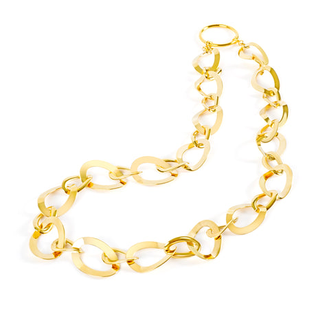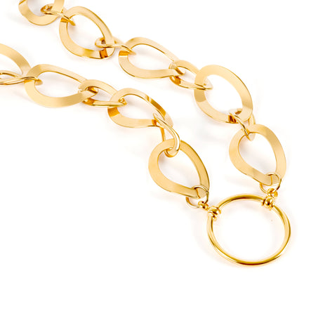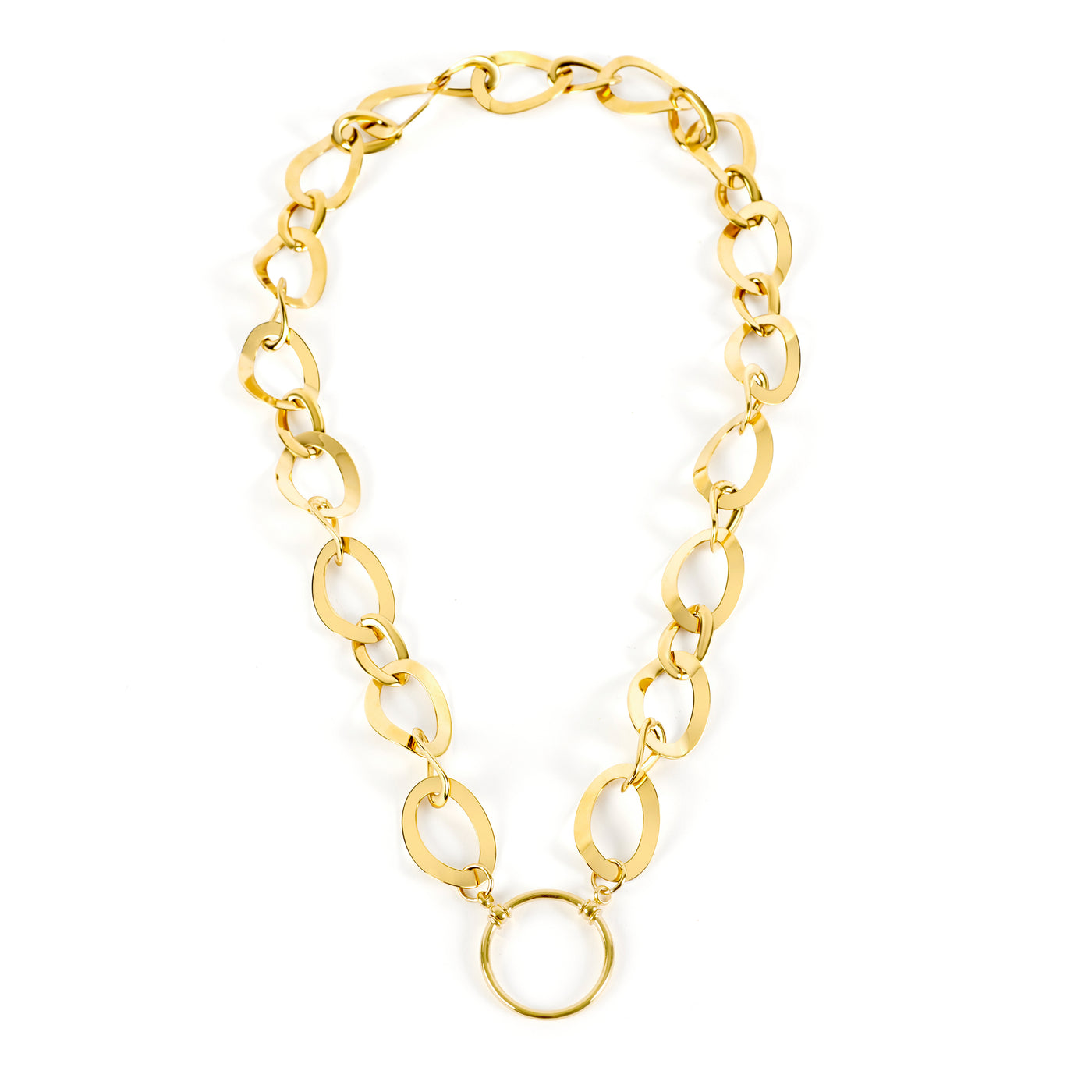A LA LOOP necklace lives within a unique category of accessory that merges the elegant clean lines of a necklace with a simple metal circle crafted to hold glasses. This golden treasure uses swooping, organically shaped chain links that evoke the 1960s “Youthquake” style of Andy Warhol’s muse Edie Sedgwick.