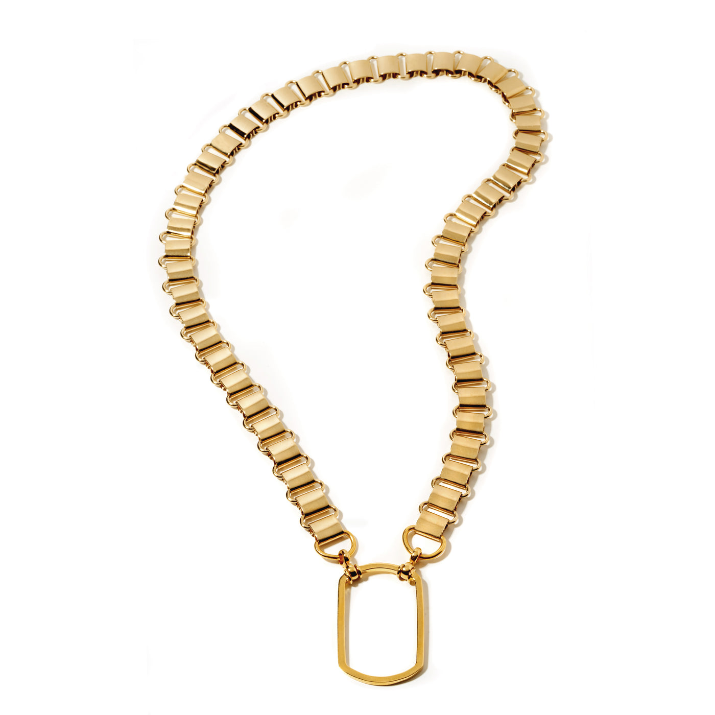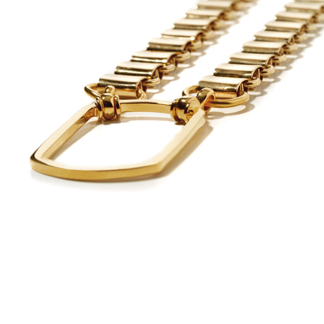 A LA LOOP necklace lives within a unique category of accessory that merges the elegant clean lines of a necklace with a simple silver circle crafted to hold glasses. This necklace is an exciting study in exaggerated shapes and proportions, and after returning from Lucio Fontana’ Earth & Gold exhibit in Rome, we wanted to bring Fontana’s abstract gold forms into our collection with this big and bold belt buckle shaped chain.