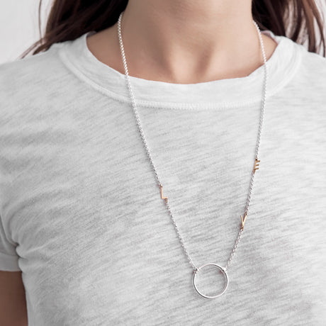 A LA LOOP necklace lives within a unique category of accessory that merges the elegant clean lines of a necklace with a simple silver circle crafted to hold glasses. This is a reboot of a vintage favorite, reimagined with all the love and appreciation for our Loopers after 21 years, with an edgy yet luxe combination of gold and satin silver. Ideal for layering with other gold and silver chain necklaces, and each letter is so small and subtle that it’s barely more than a whisper.