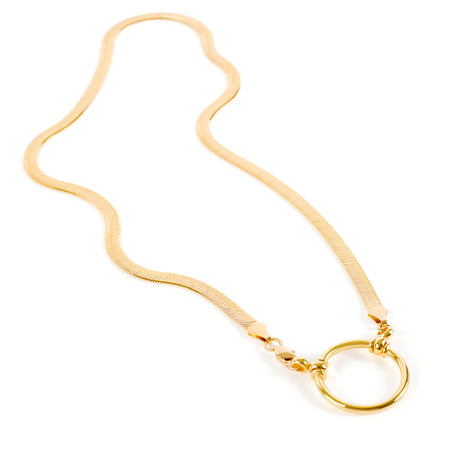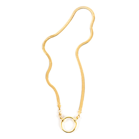 A LA LOOP necklace lives within a unique category of accessory that merges the elegant clean lines of a necklace with a simple metal crafted to hold glasses. This piece is made from an Italian flat herringbone chain, produced on the highest grade equipment to give it its exceptionally silken, flexible, tactile feel.